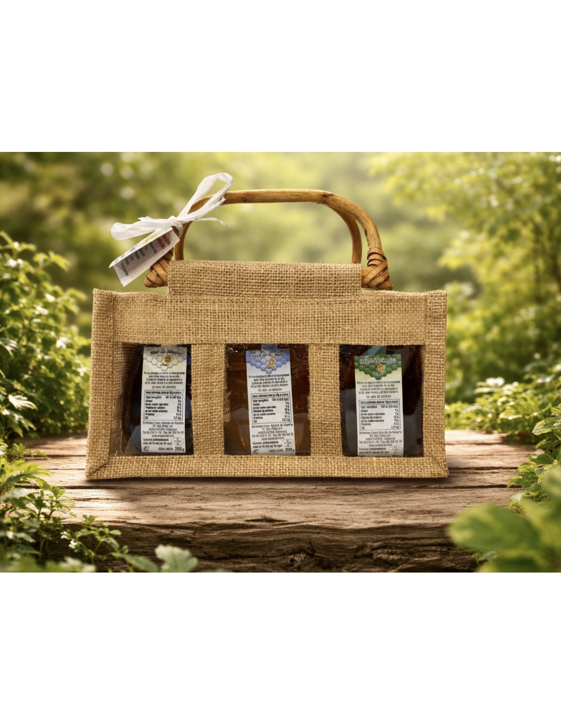 Cesta de yute con mieles de calidad extra, Romero, Tomillo y Bosque de 250 gr.